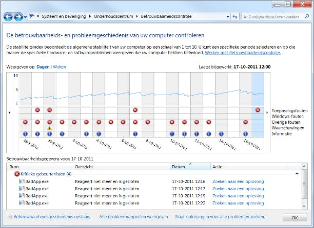 Benieuwd of er inmiddels wél oplossingen zijn voor de probleemprogramma's waarmee u te maken hebt? U kunt dit nagaan door te gaan naar Start / Configuratiescherm / Systeem en beveiliging / Onderhoudscentrum. Klik op Onderhoud zodat dit onderdeel wordt uitgeklapt en daarna op Naar oplossingen zoeken. Of u roept een handig overzicht op via link Betrouwbaarheidsgeschiedenis weergeven. U ziet dan een grafiek met per week of per dag wanneer er wat is fout gegaan. Niet alleen verongelukte programma's, maar ook andere problemen zijn er te zien. Klik op een dag of week zodat de betreffende meldingen getoond worden. Dubbelklik op een regel om een gedetailleerd probleemverslag te zien, of kies voor Zoek naar een oplossing om voor alleen dit probleem te kijken naar een oplossing. Onder Actie ziet u of er al een oplossing gevonden is. Klikt u op Alle probleemrapporten weergeven. dan ziet u onder andere welke rapporten wel en niet verstuurd zijn. Een rapport alsnog versturen kan via Zoeken naar een oplossing.