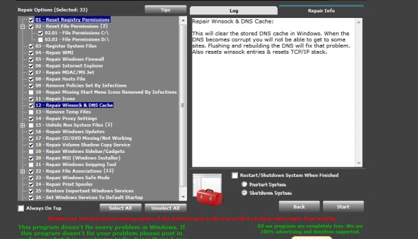 Het programma bevat een 27-tal verschillende herstelfuncties, waarvan er 22 (33 als je ook de onderliggende items meerekent) standaard geselecteerd zijn. Het gaat om erg uiteenlopende opties. Om er een paar op te noemen: herstel van WMI (Windows Management Instrumentation), opnieuw registreren van systeembestanden, Windows firewall opnieuw initialiseren, het hosts-bestand leegmaken, Windows Update-functie herstellen enzovoort.