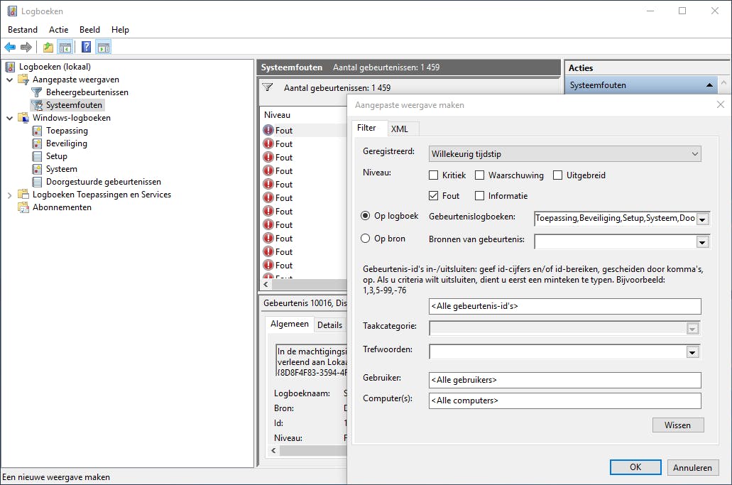 Zoals aangegeven kun je echter ook een aangepaste weergave aanmaken. Klik hiertoe de gelijknamige optie in het contextmenu of het rechterpaneel aan en leg alle gewenste criteria vast, waaronder de periode, niveau, logboek of bron, gebeurtenis-id, gebruiker enz. Bevestig met OK en geef je weergave een naam. Die wordt nu netjes toegevoegd aan de rubriek Aangepaste weergaven.