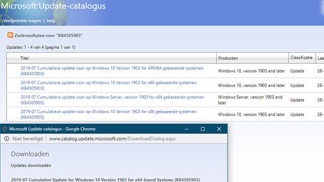 Vul je hier bijvoorbeeld kb4505903 in, dan krijg je een cumulatieve update voor Windows 10 versie 1903 te zien, voor diverse architecturen (ARM64, x64, x64 voor Windows Server en x86). Je kunt ook alle beschikbare updates voor een bepaalde Windows-versie opvragen via een zoekopdracht als Windows 10 1903 x64 (of x86).