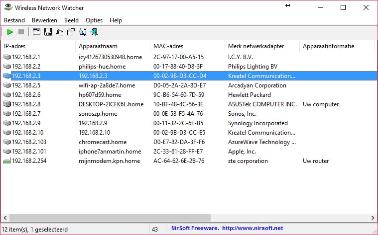 Wanneer je Wireless Network Watcher hebt gedownload (let op: voor de Nederlandse versie dien je een apart taalbestand te downloaden van de website van de maker) begint het programma direct met scannen. Je ziet binnen een aantal seconden een lijst met apparaten die met het draadloze netwerk verbonden zijn. Het fijne van dit programma is, dat de beschrijving van het apparaat ook duidelijk is, je hoeft in de meeste gevallen niet te gokken om wat voor apparaat het gaat.