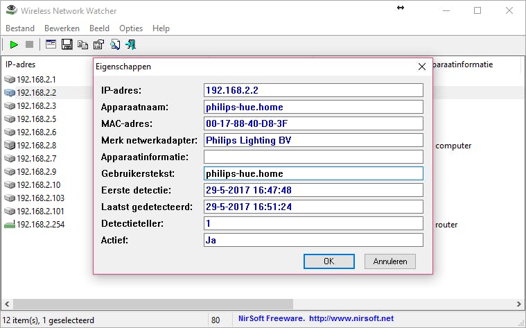**Prijs** Gratis **Taal** Nederlands **OS** Windows XP/Vista/7/8/10 **Website** [www.nirsoft.net](http://www.nirsoft.net/utils/wireless_network_watcher.html)