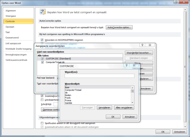 Om een niet herkend woord toe te voegen, klikt u met de rechtermuisknop op het woord en kiest u Toevoegen aan woordenlijst. Woorden wijzigen wordt het iets ingewikkelder, daar kan de woordenlijst voor aangepast worden. Ga naar Bestand / Opties / Controle en klik op Aangepaste woordenlijst. Klik op Woordenlijst aanpassen om woorden te verwijderen of toe te voegen. Eventueel kunt u een nieuwe woordenlijst toevoegen.