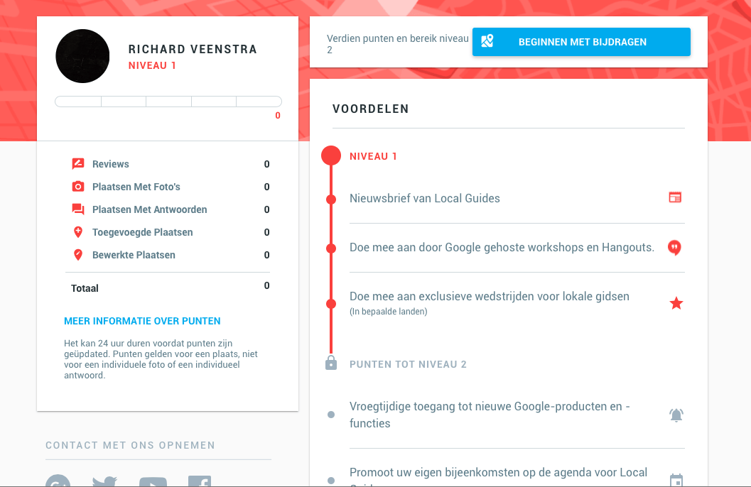 Allereerst moet je je hier aanmelden door op Nu aanmelden te klikken. Bij Selecteer uw plaats kies je je eigen locatie. Het is namelijk de bedoeling dat je zelf actief bijdragen over jouw stad gaat plaatsen. Dit kunnen recensies van restaurants of cafés zijn, maar bijvoorbeeld ook foto’s van bezienswaardigheden. Het leveren van bijdragen is een soort spel, je begint bij niveau 1. Hoe meer je bijdraagt, hoe dichterbij je bij de voordeeltjes komt. De tijdlijn hiervoor zie je aan de rechterkant. Lees ook: 12 lifehacks voor Google Maps.