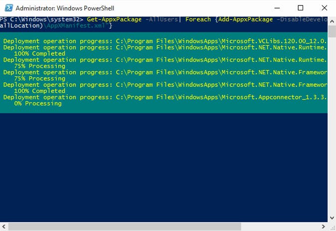 Ben je te enthousiast te werk gegaan en heb je per ongeluk allerlei apps verwijderd die je eigenlijk nog weleens wilt gebruiken? Dan kun je een groot deel van de standaard app-bundel snel herstellen. Geef hiervoor Get-AppxPackage -AllUsers| Foreach {Add-AppxPackage -DisableDevelopmentMode -Register "$($_.InstallLocation)\AppXManifest.xml"} als opdracht. Je hoeft dit niet helemaal over te typen, je kunt de opdracht ook kopiëren van de website uit de vorige tip.