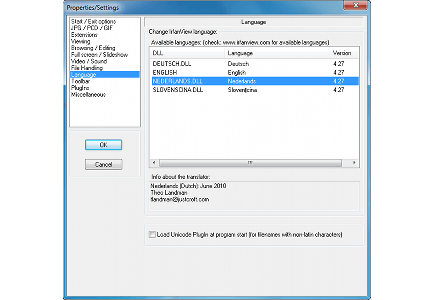 Bij het opstarten van IrfanView, zult u merken dat het programma Engelstalig is. Gelukkig is er een Nederlands taalpakket beschikbaar. Surf naar IrfanView en klik aan de linkerkant van de webpagina op IrfanView languages. Download de Installer-versie en start daarna het exe-bestand. Klik op Install om het Nederlandse taalpakket te installeren. Navigeer in het programma naar Options / Change language en selecteer NEDERLANDS.DLL. Bevestig met OK, alle menu's worden nu direct vertaald. Sommige onderdelen van de software blijven overigens nog wel Engelstalig.