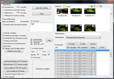 Wilt u een complete map met foto's bekijken, dan klikt u in het hoofdprogramma van IrfanView op de knop Diavoorstelling. Er verschijnt een nieuw venster, waarin u de weergave bepaalt. Zoek aan de rechterkant alle foto's op die u wilt bekijken. Nuttig is dat u bestanden uit verschillende mappen kunt selecteren. Beslis hoeveel seconden er tussen de dia's moeten zitten. Het is leuk om een willekeurige volgorde te selecteren en een mp3-bestand als achtergrondmuziek af te spelen. Ook voegt u indien gewenst teksten toe. Klik op de knop Speel diavoorstelling om deze te starten.