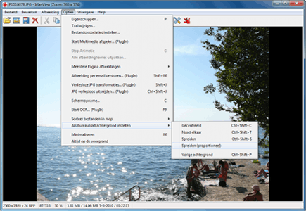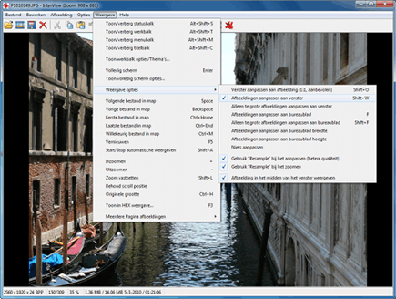 U beslist zelf op welke wijze u de afbeeldingen in IrfanView wilt weergeven. Ga in het menu naar Weergave / Weergave opties. Handig is de mogelijkheid om de foto's aan te passen aan de grootte van het venster. Op die manier hoeft u geen schuifknoppen te gebruiken om de foto in beeld te brengen. Verder kunt u er ook voor kiezen om de werkelijke grootte van de afbeelding te tonen. In het menuonderdeel Weergave beschikt u ook over opties om bepaalde werkbalken te verbergen of een volledig scherm te activeren.