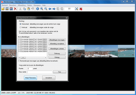 Bij het fotograferen vanaf een uitkijktoren is het onmogelijk om het volledige uitzicht op een foto vast te leggen. Gelukkig biedt IrfanView daarvoor een nuttige oplossing, u kunt afbeeldingen aan elkaar plakken. U opent het juiste menu via Afbeelding / Maak panorama afbeelding. Klik op Afbeeldingen toevoegen en zoek de bestanden op. Middels de knoppen Omhoog en Omlaag plaatst u ze in de goede volgorde. Klik op Maak panorama om het resultaat te bekijken en sla het eventueel op. Het is ook mogelijk om de afbeeldingen verticaal onder elkaar te plaatsen.