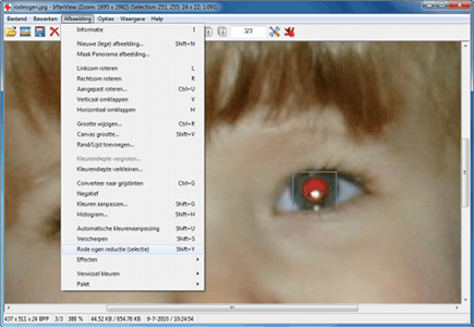 Als u weleens portretfoto's met flitslicht maakt, dan herkent u vast de rode ogen. Deze ontstaan doordat de pupillen niet snel genoeg reageren op het omgevingslicht, waardoor er rode bloedvaten van het netvlies te zien zijn. De meeste fotobewerkingsprogramma's hebben een functie om het op een realistische manier te corrigeren. Gebruik de zoom-knop met het vergrootglas om de ogen goed in beeld te brengen en maak een zorgvuldige selectie met de cursor. Navigeer in het menu daarna naar Afbeelding / Rode ogen reductie.