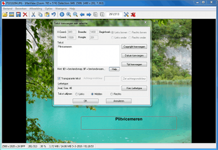 Om iets te verduidelijken plaatst u gemakkelijk een tekst binnen een afbeelding. Maak met de cursor een selectie op de plek waar u een tekst wilt invoegen. Ga daarna naar Bewerken / Tekst toevoegen aan selectie. Typ de gewenste woorden en klik op de knop Kies Lettertype. Selecteer een mooi lettertype en pas de lettergrootte naar eigen inzicht aan. Ook kunt u een andere kleur selecteren en de tekst cursief, vet of onderstreept weergeven. Verder lijnt u de woorden links, rechts of in het midden uit. Bevestig met OK om de tekst definitief te plaatsen.