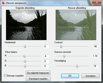 Bent u niet tevreden met de kleuren van uw foto? Gelukkig doet u daar eenvoudig iets aan! Open het juiste menu via Bewerken / Kleuren aanpassen. U ziet twee afbeeldingen naast elkaar, zodat u gemakkelijk de nieuwe en de oorspronkelijke foto met elkaar vergelijkt. Gebruik de schuifknoppen bij Contrast, Gamma correctie en Verzadiging om de weergave aan te passen. Verder stelt u naar eigen inzicht een andere kleurbalans in door te spelen met de waarden van de primaire kleuren rood, groen en blauw. Ten slotte hebt u ook de mogelijkheid om de Helderheid te wijzigen. Sluit het dialoogvenster met OK.