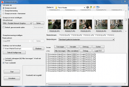 U kunt IrfanView gebruiken om foto's om te zetten naar een ander bestandsformaat. Ga naar Bestand / Groepsconversie/Hernoemen, zoek de afbeeldingen op en sleep ze naar het onderste deelvenster. U kunt hiervoor ook de knoppen Toevoegen of Alles toevoegen gebruiken. Bepaal in het uitrolmenu bij Uitvoerformaat het juiste grafische formaat en selecteer onder Doelmap de gewenste locatie. U klikt vervolgens op Start, waarna het proces begint. Overigens gebruikt u het dialoogvenster Groepsconversie tevens om meerdere bestanden een andere naam te geven.