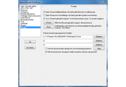 Mocht IrfanView een geavanceerde bewerking niet uit kunnen voeren, dan doet u vanuit het programma rechtstreeks een beroep op andere fotobewerkingssoftware. Klik in het menu op de knop Eigenschappen en ga naar de optie Overige. Kies onder Externe bewerkingsprogramma's instellen voor Bladeren en zoek het exe-bestand van de betreffende software op, bijvoorbeeld Photoshop Elements of GIMP 2. U voegt maximaal drie programma's toe. Sluit het menu met OK. Via Bestand / Open met bewerker start u de foto direct met het andere pakket op.