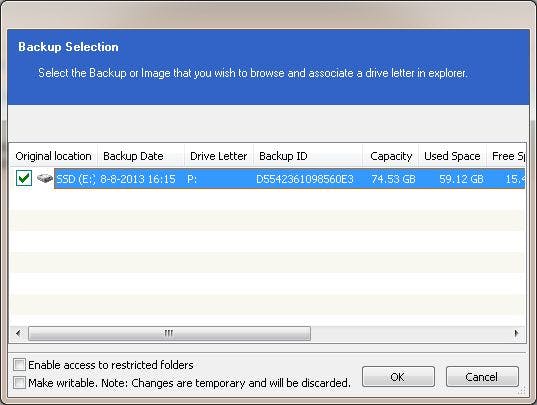 Hebben we een of meer bestanden uit een image nodig dan gaan we links naar het tabblad Restore. In het hoofdvenster zien we nu het zojuist gemaakte image en de bijbehorende schijf. Met een klik op Restore Image kunnen we nu de hele schijf herstellen. Met een klik op Browse Image zien we het image-bestand. We zetten er een vinkje voor en accepteren de voorgestelde stationsletter (Afb.3). Met een klik op OK wordt het image in Verkenner geopend en kunnen we er willekeurige bestanden uit kopiëren. In het menu Restore, Detach Image kunnen we een aldus geopend image-bestand weer sluiten.