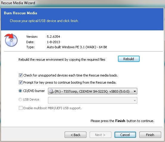 Zo, u hebt nu in elk geval één image-bestand en u weet hoe u er losse bestanden of mappen uithaalt. Maar wat als uw schijf of Windows het helemaal begeeft? Dan moet u het complete imagebestand terugzetten en dat kan als uw systeem het begeven heeft alleen vanaf een extern opstartmedium: de rescue-disc. Wanneer u na uw eerste image Reflect al een keer hebt afgesloten en weer geopend wordt u er automatisch aan herinnerd om zo’n schijf te maken maar zo niet dan gaan we naar Other Tasks, Create Rescue Media. We kunnen nu uit twee smaken kiezen: Windows PE of Linux, waarbij de eerste de standaard is die wij ook aanhouden. We klikken tweemaal op Next om de standaards te accepteren en in het waarschuwingsvenster klikken we Continue en Cancel bij de update-melding. Reflect wil de rescue-disc op cd branden en dus plaatsen we een leeg schijfje in de brander en klikken op Finish (Afb.4). Na korte tijd is de opstartschijf (154 MB) klaar.