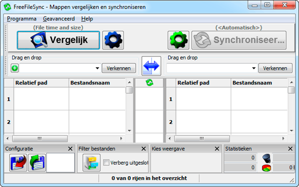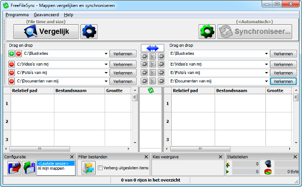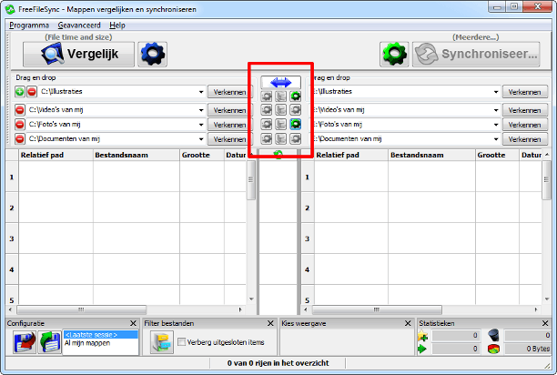 Om vooraf te zien wat er tijdens het synchroniseren met uw bestanden zal gebeuren, klikt u op de knop Vergelijk. Er wordt dan nog niet gesynchroniseerd, maar u ziet wel per bestand welke actie het programma van plan is te ondernemen. Helemaal onderin ziet u de statistieken. In de middenkolom ziet u per bestand in welke richting gesynchroniseerd zal worden. Haalt u een vinkje weg, dan doet dat bestand dit keer niet mee. Bent u het niet eens met de actie, dan kunt u ook voor een andere actie kiezen. U hebt zelf dus best veel controle.