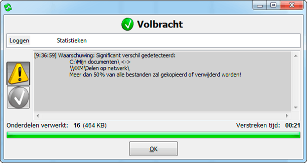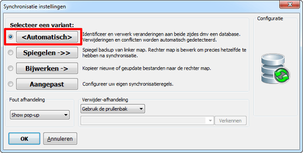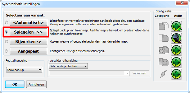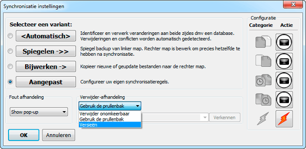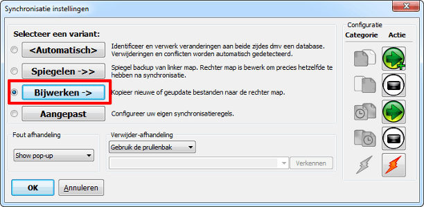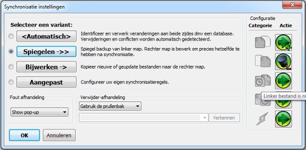 Er zijn dus drie kant-en-klare synchronisatievarianten en daarnaast nog eentje die u helemaal naar uw smaak kunt inrichten. Verder kunt u de foutafhandeling het beste op Show pop-up laten staan. Komt het programma er even niet uit, dan krijgt u een melding te zien. Bij Verwijder-afhandeling geeft u aan wat er met weggegooide bestanden moet gebeuren. Standaard is dat Gebruik de prullenbak. Kies Versieën (sic) als u meerdere versies wilt bewaren. Heel handig om als back-up te gebruiken. Klik op OK om terug te keren naar het hoofdscherm.