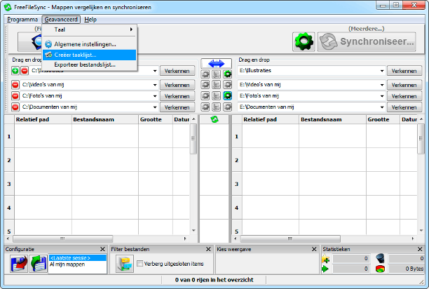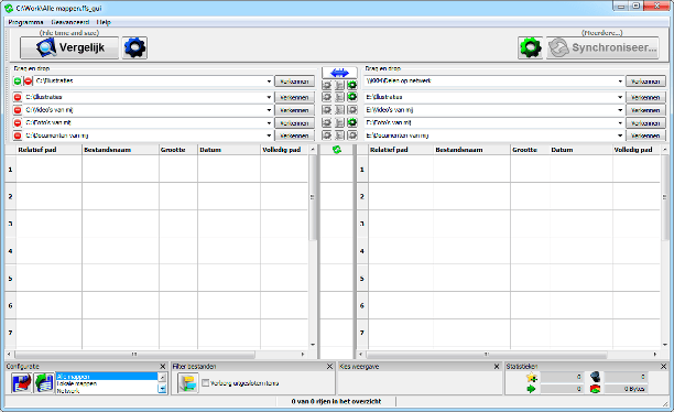 Het is goed denkbaar dat u niet altijd dezelfde mappen wilt synchroniseren, of dat u dit soms naar een ander opslagmedium of een andere locatie wilt doen. Dat kan door met configuraties te werken. Het setje mappen dat u in FreeFileSync hebt ingetikt, bewaart u als configuratie door linksonder op het floppy met de rode pijl te klikken en een bestandsnaam in te tikken. Daarna kan een eerder aangemaakte configuratie weer ingeladen worden via het pictogram met de groene pijl. Ernaast zijn de drie laatst gebruikte configuraties rechtstreeks te selecteren.