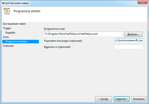 Open de taakplanner via Start / Alle programma's / Bureau-accessoires / Systeemwerkset / Taakplanner. Kies rechts Basistaak maken en doorloop de wizard. Kies Een programma starten en vul C:\Program Files\FreeFileSync\FreeFileSync.exe in. Bij Parameters toevoegen (optioneel) vult u het pad van het zojuist bewaarde batch-bestand in, bijvoorbeeld C:\Mijn map\Synchroniseren.ffs_batch. Het synchronisatieritme past u eventueel apart aan, door in de Bibliotheek voor Taakplanner met rechts op uw taak te klikken, en vervolgens Eigenschappen en Triggers.