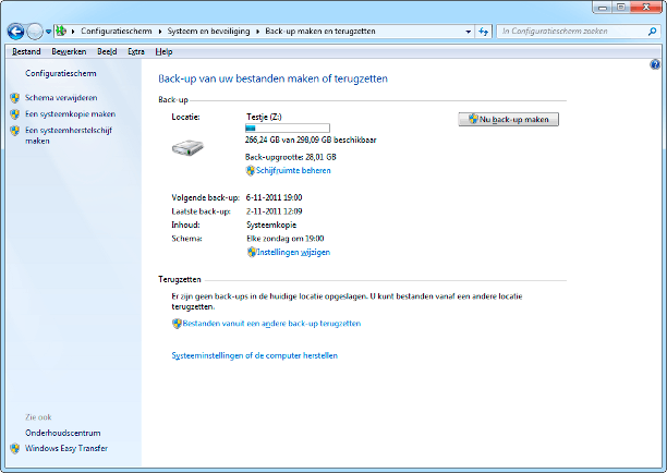 Een systeemback-up maken kan onder Windows 7 via Start / Configuratiescherm / Systeem en beveiliging / Back-up maken en terugzetten. Klik op Back-up instellen en wijs een schijf aan waar de reservekopie terecht moet komen. Het is verstandig hier geen interne maar een externe schijf of netwerkschijf (NAS) voor te gebruiken. U kunt het volledig aan Windows overlaten wat er bewaard moet worden, maar beter is het om dit zelf aan te geven via Zelf bepalen. U kunt een pure systeemkopie maken, of ook uw eigen bestanden in de back-up laten meenemen.