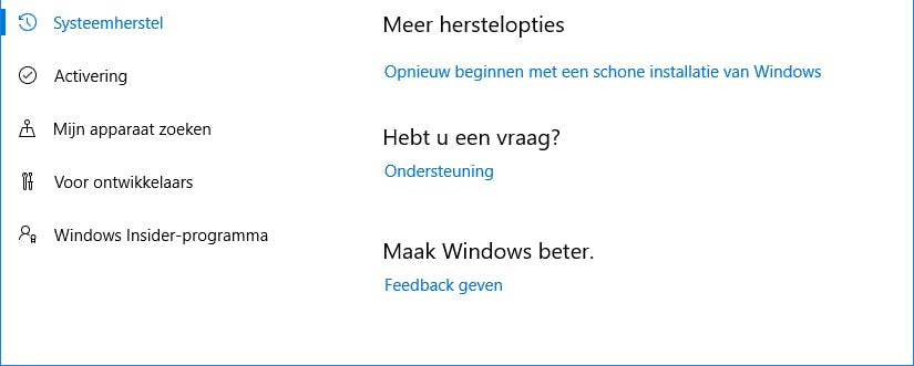 De functie Nieuwe Start vind je bij Instellingen, Bijwerken en beveiligen en vervolgens Systeemherstel. Klik in het scherm van Systeemherstel op de link Opnieuw beginnen met een schone installatie van Windows.