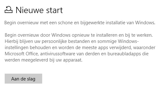 Het onderdeel Nieuwe Start wordt nu geopend. Klik in dat scherm op de knop Aan de slag om de procedure te starten.