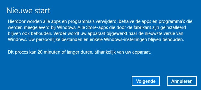 Je krijgt nu nogmaals de waarschuwing dat je al je geïnstalleerde programma's kunt kwijtraken. Verder staat er vermeld dat de procedure voor de schone installatie zo'n 20 minuten in beslag kan nemen, maar dat duurt in de meeste gevallen toch een stuk langer.
