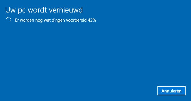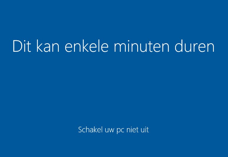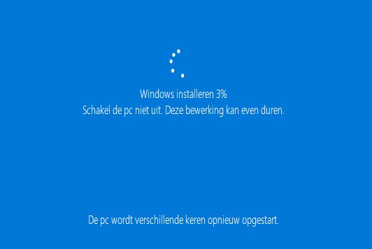 Je kunt nu rustig achterover gaan zitten, want de installatieprocedure gaat nu voor de rest vanzelf. De computer zal hierbij automatisch een aantal keer opnieuw worden opgestart, net zoals dat bij een nieuwe installatie van Windows 10 gaat.