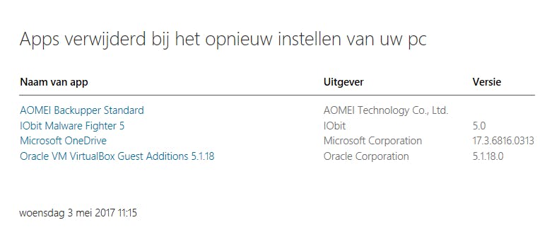 Nadat je pc helemaal weer 'schoon' is, wil je misschien weer al je programma's installeren. Op het bureaublad vind je een bestand genaamd Verwijderde apps.html. Dit is een html-bestand die je kunt openen in je webbrowser en geeft informatie weer over welke programma's er allemaal zijn verwijderd tijdens de procedure. De namen van de programma's kun je aanklikken, waarna je op de webpagina komt van de fabrikant van het product, zodat je de software eventueel opnieuw kunt downloaden.