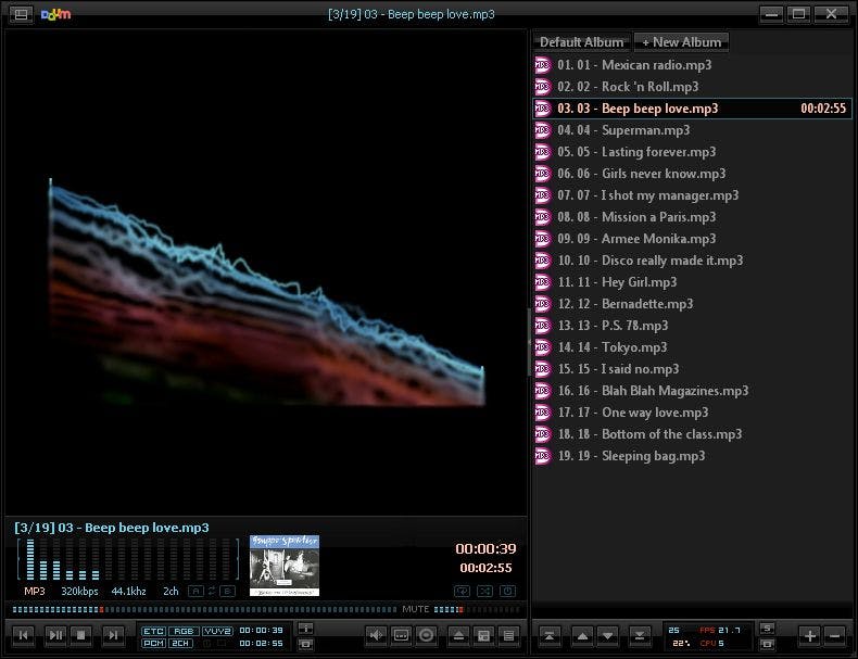 Elk ondersteund bestandstype wordt nu automatisch geopend door Potplayer wanneer we erop dubbelklikken. Laten we dat om te beginnen eens doen voor een mp3-bestand (Afb.1). Een paar dingen vallen op. Potplayer gebruikt standaard een bekende visualisatie van de Windows mediaspeler (we komen hier nog op terug). Onderaan het venster zien we een grote hoeveelheid informatie en de nodige knoppen voor de bediening en rechts staat de naam van het nummer dat wordt afgespeeld. Bevat uw map meerdere gelijksoortige bestanden dan wordt automatisch een afspeellijst gemaakt van al die bestanden.