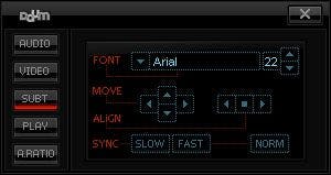 Net als het geluid bij een video willen ook de ondertitels nog wel eens niet synchroon lopen, bijvoorbeeld als u een ondertitelbestand hebt gedownload dat niet precies bij uw versie van de film past. Via het controlepaneel (F7) en de knop Subs (Afb.4) kunt u dan met de knoppen Slow, Fast en Norm de weergavesnelheid beïnvloeden. Dat is echter niet alles. U kunt ondertitels verplaatsen (Move) met de vier pijltjes of links, rechts of in het midden uitlijnen (Align) met de vier pictogrammen daarnaast. Uiteraard zijn hiervoor ook weer sneltoetsen beschikbaar.