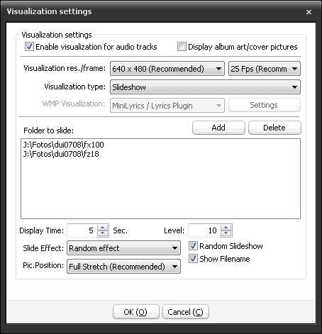 Er zijn twee belangrijke aspecten aan het uiterlijk van Potplayer. De eerste daarvan is de weergave tijdens het afspelen van muziek. Instellingen hiervoor vindt u door te rechtsklikken in het weergavevenster en te kiezen voor Visualisation. U kunt hier kiezen uit de ingebouwde visualisatie (Floating balls), een visualisatie van Windows Mediaspeler (WMP), een combinatie van beiden of een diashow van foto’s op uw harde schijf. Voor dat laatste kiezen we Visualisation Settings met als Visualisation type Slideshow. Vervolgens kunnen we met Add fotomappen toevoegen. Dit werkt overigens niet recursief, dus u moet submappen individueel opgeven (Afb.5). Onder de lijst met mappen vindt u nog instellingen voor onder andere duur (Display Time) en overgangen (Slide Effect).