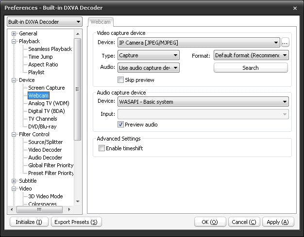 Onder Device ziet u de nodige apparaten waarmee Potplayer kan communiceren. Zo kunt u het programma bijvoorbeeld gebruiken om het beeld van een webcam weer te geven.