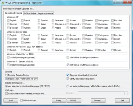 Het gebruik van WSUS Offline Update gebeurt in twee stappen: eerst genereert u een updatemedium, en daarna installeert u dit. Voor het genereren (met het programma UpdateGenerator) moet u wel eventjes tijd uittrekken, want u hebt enorm veel keuzes. Het programma ondersteunt Windows XP, Windows Server 2003, Windows Vista/Server 2008 en Windows 7/Server 2008 R2. Voor XP en 2003 kunt u nog uw taalpakketten kiezen, maar voor de andere besturingssystemen hebt u enkel de keuze uit de 32- of 64bits-versies van een globaal meertalig updatepakket.