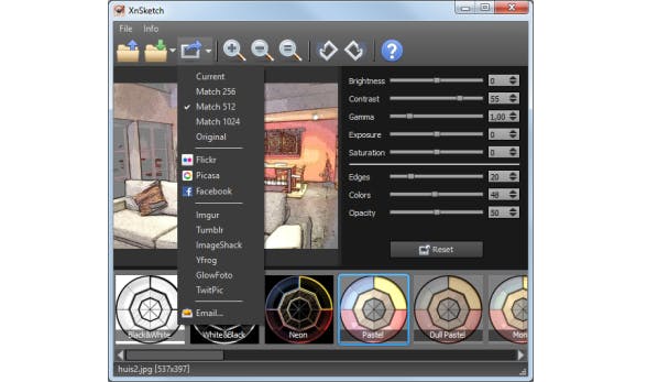 Gelukkig hoef je niet tevreden te zijn met de voorinstelling van XnSketch. Rechts van de voorbeeldweergave zitten nog acht schuifknoppen waarmee je snel en eenvoudig diverse aspecten kunt optimaliseren. We hebben het over opties als Brightness, Contrast, Saturation, Edges en Opacity.
