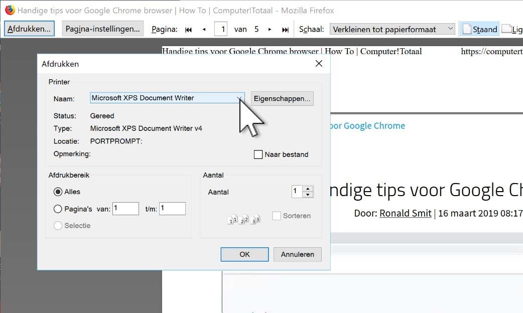 Om het gegenereerde .oxps-bestand te bekijken, dubbelklik je er simpelweg op. Standaard opent het in de met Windows 10 meegeleverde viewer. Heb je op jouw systeem een andere viewer staan die gekoppeld is aan het bestandsformaat, dan opent het daarin. Zoals je ziet is de layout van het XPS-document precies hetzelfde als deze op een papieren afdruk zou zijn. De XPS kun je in de toekomst desgewenst altijd nog eens echt op papier afdrukken. Nog een tipje tot slot: sommige webpagina's worden een puinhoop als je ze gaat afdrukken. Ook een PDF - die inmiddels gebruik maakt van een virtuele printerdriver voor het genereren ervan - verwordt dan tot diezelfde puinhoop. Als je geluk hebt is voor zo'n dwarsliggende pagina de leesmodus beschikbaar. klik op het knopje in de vorm van een vel papier helemaal rechts van het webadres in de adresbalk van - in dit voorbeeld - Firefox. Je ziet nu veelal een nette maar eenvoudige weergave van de pagina verschijnen. Die is in dezelfde vorm afdrukbaar, en dus ook om te zetten naar XPS. Na afloop klik je weer op de leesweergaveknop waarna de oorspronkelijke opmaak terugkeert.