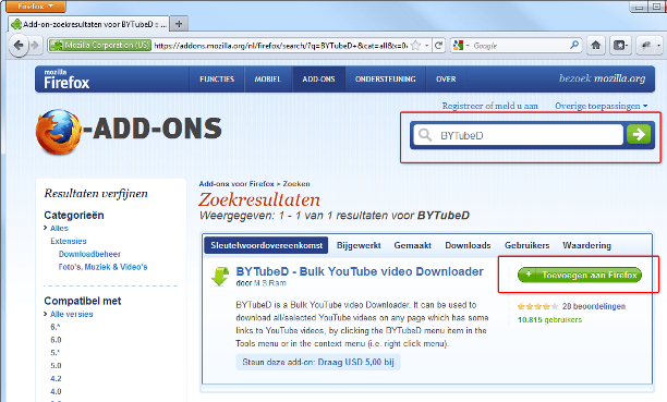De volledige naam van BYTubeD luidt 'Bulk YouTube video Downloader'. Het betreft een uitbreiding voor Firefox. BYTubeD 'ziet' alle YouTube-filmpjes op een webpagina, waarna u deze kunt downloaden. Dit maakt het eenvoudig om bijvoorbeeld een eigen YouTube-afspeellijst te downloaden. BYTubeD bewaart de filmpjes als losse video-bestanden. Ook zonder een eigen afspeellijst kunt u BYTubeD gebruiken, bijvoorbeeld om alle filmpjes vanuit een YouTube-kanaal binnen te halen. Het is goed om een aparte map aan te maken voor de binnen te halen YouTube-filmpjes. Maak bijvoorbeeld de map Mijn YouTube downloads aan op uw bureaublad. Open Firefox en surf naar Mozilla Addons, de standaardwebsite voor alle Firefox-uitbreidingen. Zoek op BYTubeD en installeer de uitbreiding. Voordat u BYTubeD kunt gebruiken, dient u de webbrowser te herstarten.
