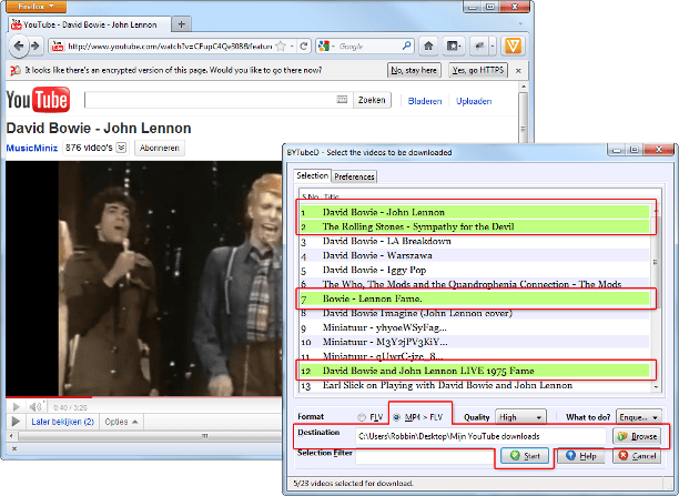 Open nu uw YouTube-afspeellijst of een pagina op YouTube waar één of meerdere filmpjes op staan die u wilt downloaden. Klik met de rechtermuisknop op een lege plek op het scherm en kies BYTubeD. De uitbreiding wordt nu gestart. U moet eenmalig twee instellingen veranderen. Bepaal onder in beeld de kwaliteitsinstelling voor de downloads: High / MP4>FLV. Geef met de knop Browse aan waar u de filmpjes wilt bewaren, bijvoorbeeld in de map 'Mijn YouTube downloads' die u bij de vorige stap hebt aangemaakt. BYTubeD toont een overzicht van alle YouTube-filmpjes op de huidige pagina. Klik het filmpje aan dat u wilt downloaden. U kunt meerdere filmpjes selecteren door de Ctrl-toets ingedrukt te houden terwijl u de filmpjes aanklikt. Gebruik de toetscombinatie Ctrl+A om alle filmpjes in één keer te selecteren. Klik op Start om BYTubeD aan het werk te zetten en de filmpjes te downloaden.