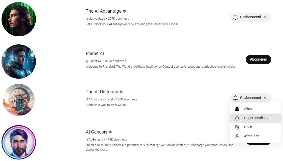 Standaard ontvang je nu gepersonaliseerde meldingen. Het YouTube-algoritme stuurt meldingen op basis van je kijk- en abonnementsactiviteit, met een focus op de video’s die voor jou interessant kunnen zijn. Pas dit aan door op het belpictogram te klikken. Daar kun je kiezen voor Alles (meldingen voor elke nieuwe video en kanaalupdate), Geen, of Afmelden (als je je voor dit kanaal wilt afmelden).
