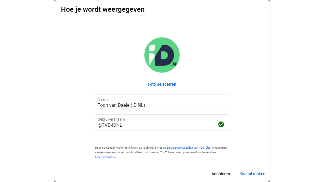 Je Gebruikersnaam is je unieke identificator op YouTube, standaard voorafgegaan door een @-teken. Dit maakt je kanaal eenvoudiger te vinden en te delen. Bij Foto selecteren kun je een profielfoto uploaden of aanpassen. Deze wordt gekoppeld aan je YouTube-account en is zichtbaar in je kanaal. Bevestig je instellingen met Kanaal maken.