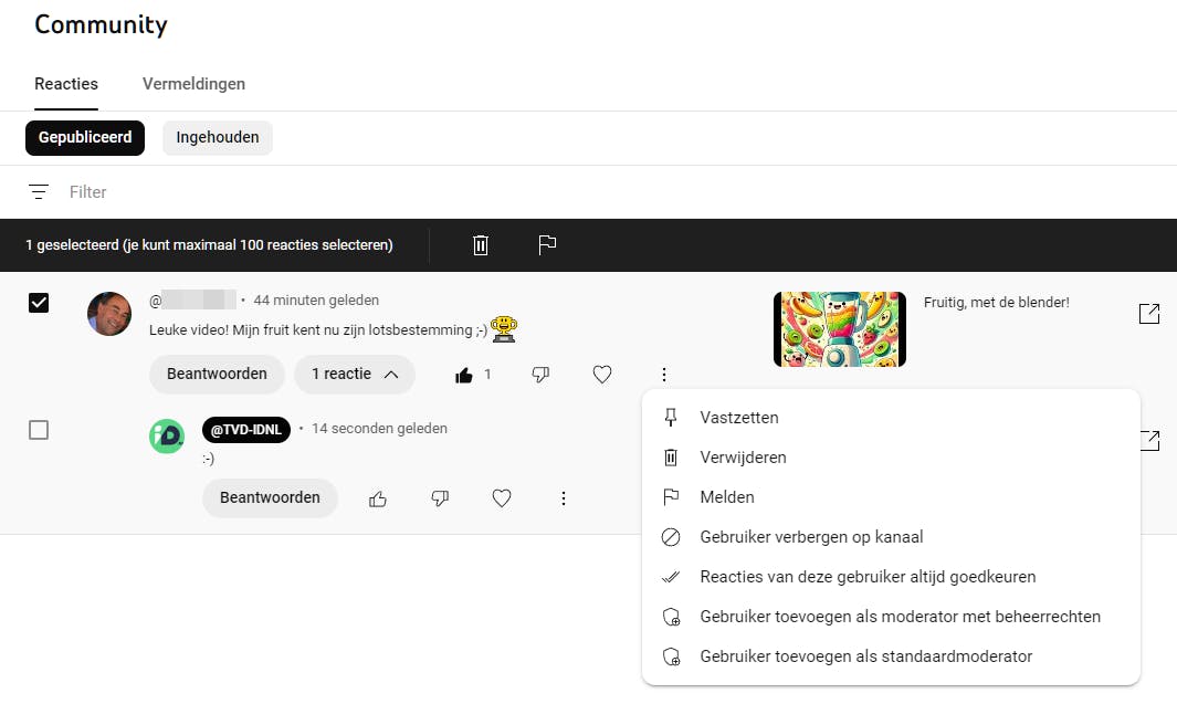 Vanuit de rubriek Community kun je alle reacties en vermeldingen beheren.