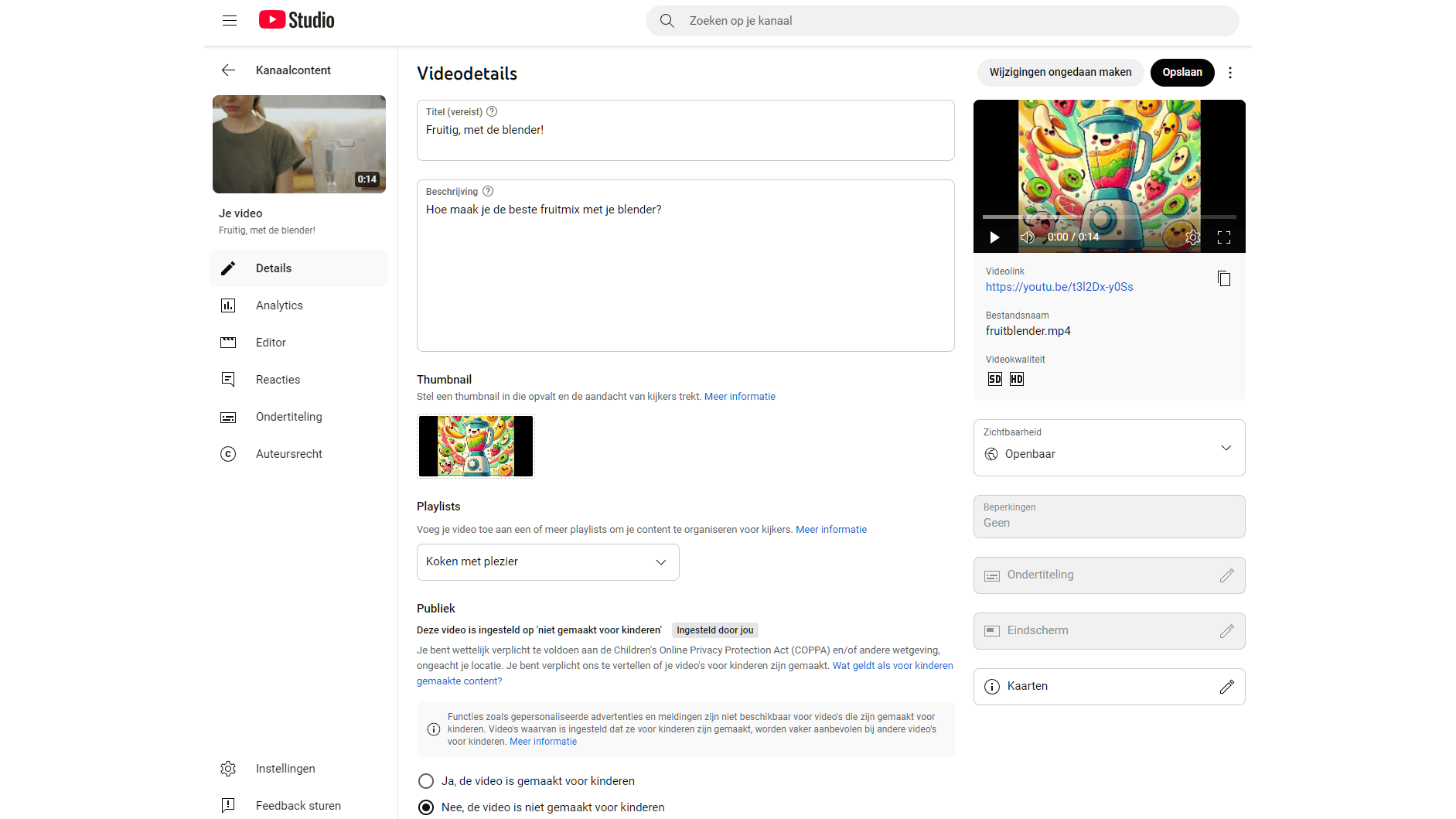 Je kunt uiteraard altijd nog wijzigingen doorvoeren vanuit de rubriek (Kanaal)Content. Met het potloodicoontje naast een video voer je aanpassingen door die je bevestigt met Opslaan.