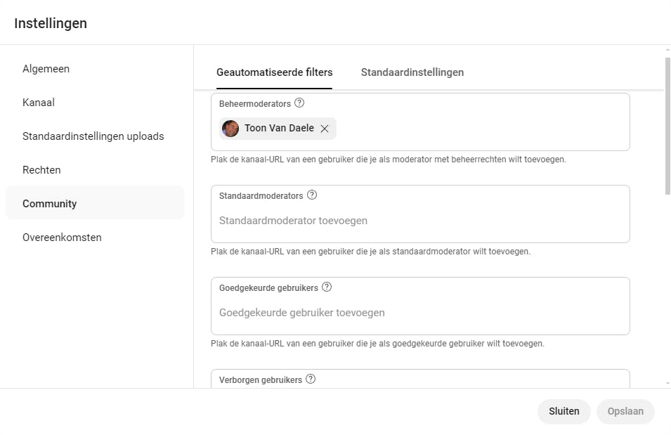 In de rubriek Instellingen, bij de sectie Community, vind je diverse handige opties. Op het tabblad Geautomatiseerde filters voeg je gebruikers toe als Standaardmoderator of Beheermoderator. Deze laatste kan bijvoorbeeld ook andere moderators beheren. Je bepaalt hier ook welke kanalen hun kijkers naar jouw livestreams mogen doorsturen, zoals alle kanalen of specifieke kanalen die je zelf selecteert. Daarnaast kun je Geblokkeerde woorden instellen om reacties met die woorden automatisch te laten tegenhouden. Op het tabblad Standaardinstellingen stel je in of reacties op je kanaal zijn toegestaan.