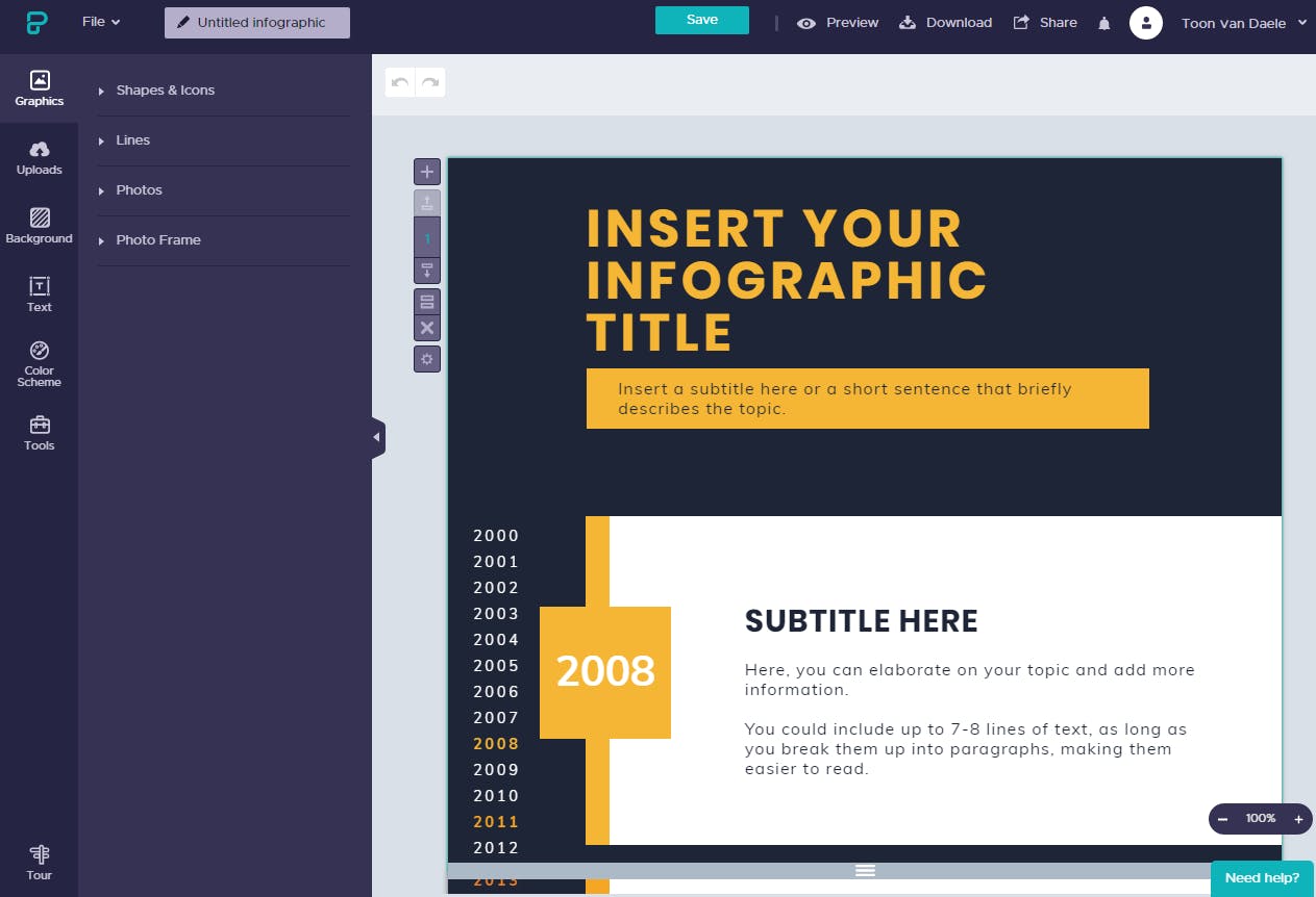 Meld je via Sign up aan bij de app – dat kan overigens ook met je Google- of Facebook-account. Even later beland je dan in je persoonlijke dashboard. Hier klik je meteen op Create New en op Infographic. Fiets even door het sjabloonaanbod en klik op Preview en op Use Template bij een geschikt sjabloon. Je belandt nu in de online editor.