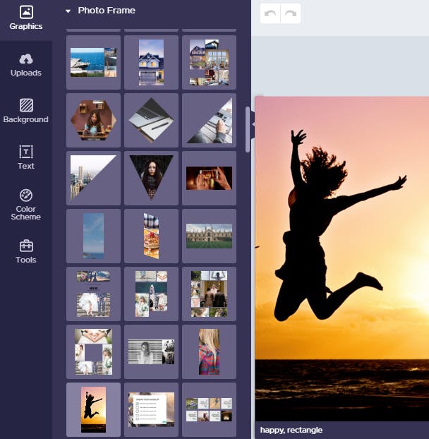 Je kunt uiteraard ook plaatjes toevoegen. Klik op Graphics in het linkerpaneel en kies een geschikte subrubriek: Shapes & icons, Lines, Photos of Photo Frames. Deze laatste fungeren als maskers. Sleep je een foto naar zo’n masker, dan neemt de foto die vorm aan. Open de rubriek Uploads om eigen afbeeldingen toe te voegen. Jammer genoeg beperkt de gratis versie van PiktoChart je tot een magere 40 MB opslagruimte. Afbeeldingen laten zich net als tekstvakken ook schalen, roteren en verplaatsen.