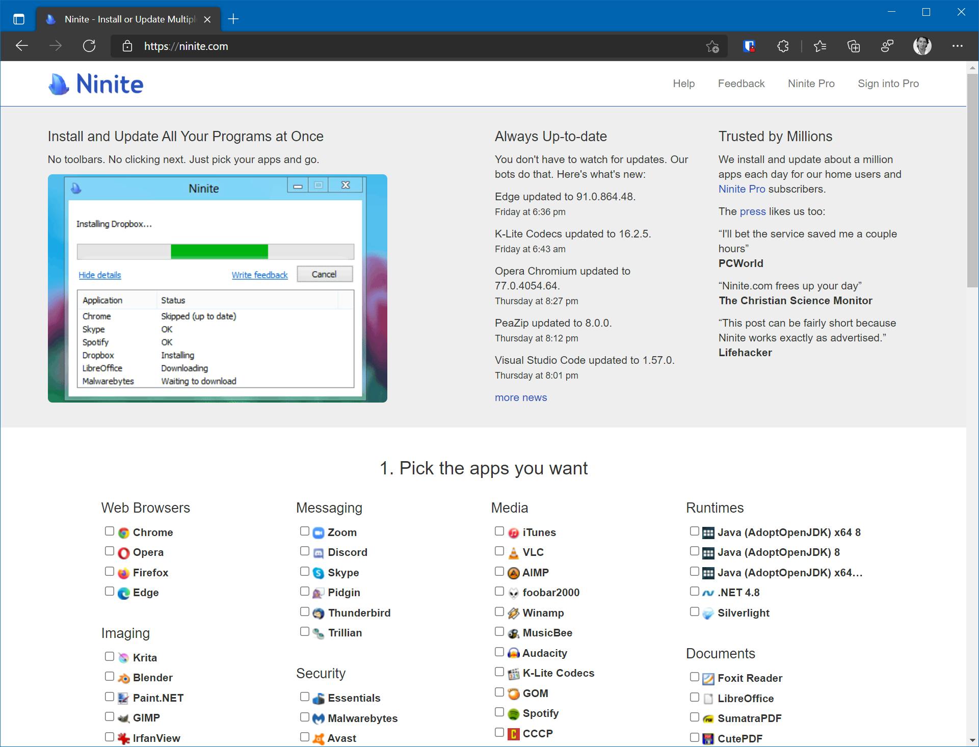 Bij deze dienst kun je een selectie van favoriete programma’s opgeven, waarna Ninite hiervan een pakket samenstelt dat je vervolgens in een keer kunt installeren. Het resultaat: je bent sneller klaar en weet zeker dat je niets over het hoofd ziet. Ninite haalt de software binnen via de officiële servers van de makers en niet via derde partijen. Ook kiest het automatisch de 32-bit of 64-bit versie en weigert het ‘onnodige’ onderdelen (zoals toolbars) tijdens de installatie mee te installeren.