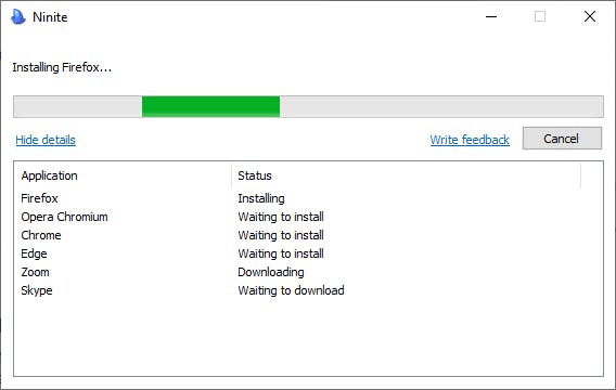 De installatie gaat automatisch: Ninite loopt door de losse installatieschermen heen (in de achtergrond van Windows) en installeert de programma’s in de taal van Windows, zoals Nederlands. Wil je het venster van Ninite zien, dubbelklik dan op het bijbehorende pictogram in het systeemvak van Windows. Het venster houdt je op de hoogte van de voortgang: je ziet bovenin welk programma momenteel wordt geïnstalleerd. Klik op Hide details om minder informatie te tonen. In het tweede gedeelte van het programmavenster zie je welke programma’s worden geïnstalleerd. De kolom Status geeft aan of het programma is geïnstalleerd of dat dit nog moet gebeuren.
