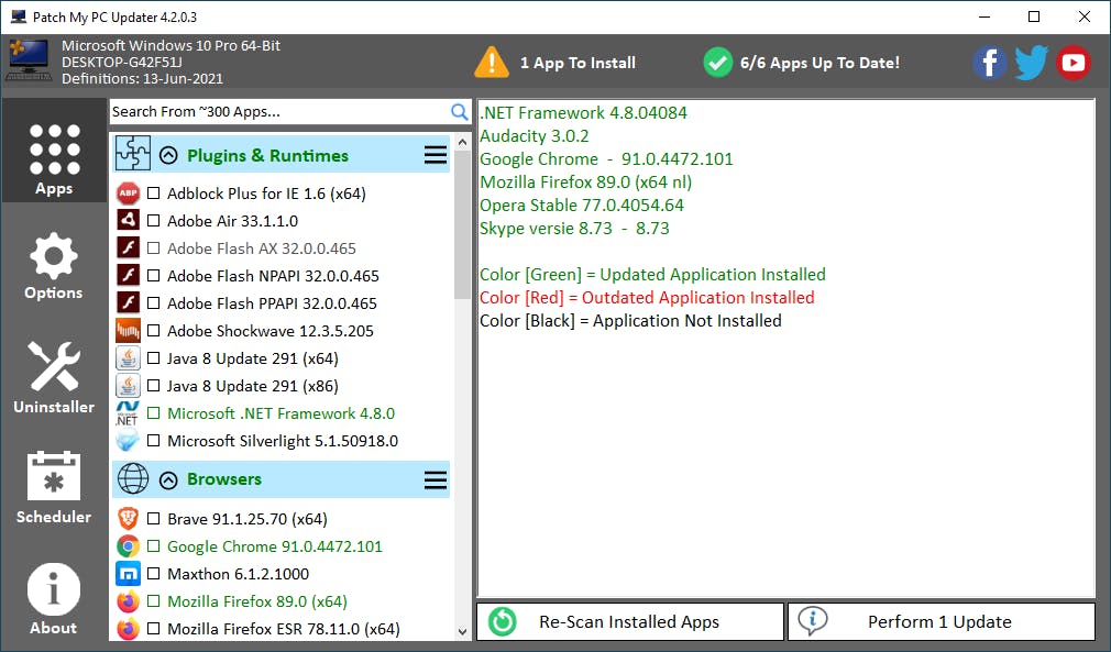 De eerste keer dat je het programma opent, controleert het automatische welke software al is geïnstalleerd. In het venster rechts zie je in hoeverre de software nog up-to-date is. Groengekleurde programma’s zijn actueel, terwijl een rode kleur betekent dat het programma verouderd is. Is de lijst niet compleet of heb je nieuwe versies geïnstalleerd, klik dan op Re-Scan Installed Apps om de controle nogmaals uit te voeren. Links in het venster vind je een overzicht van beschikbare apps die je met Patch My PC Updater in een keer kunt installeren. Net als bij Ninite wordt er gebruik gemaakt van verschillende categorieën, zoals Browsers en Multimedia. Programma’s in de lijst met een kleur (zoals groen of rood) zijn al aanwezig op het systeem.