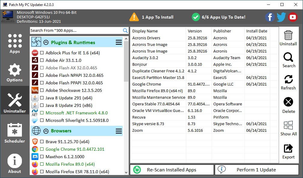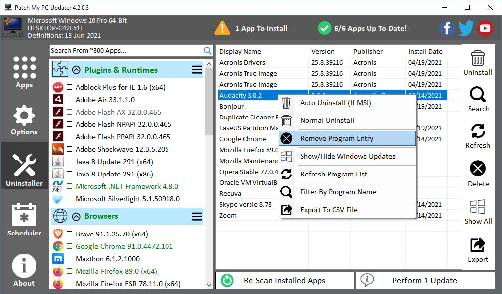 Niet alleen voor het toevoegen, maar ook voor het verwijderen van programma’s kun je gebruik maken van Patch My PC Updater. Klik op de sectie Uninstaller. Rechts vind je een lijst met geïnstalleerde programma’s. Via de knoppen rechts in het venster kun je geselecteerde programma’s eenvoudig verwijderen. Wanneer je met de rechtermuisknop op een programma klikt, zie je nog meer opties. Heb je het programma al eerder van het systeem verwijderd – via het bijbehorende de-installatieprogramma – maar vermeldt Windows het nog steeds in de lijst met geïnstalleerde programma’s? Klik met rechts op de vermelding en kies voor Remove Program Entry.